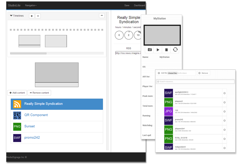 SignageStudio Lite is a 100% FREE, simpler version of SignageStudio Pro that's built on top of HTML5, so it runs everywhere. It is where users will spend most of their time building, configuring, controlling and maintaining the entire Digital Signage network.